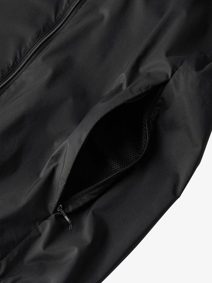 衣服内のムレを排出するベンチレーションは、生地の切替を利用したシンプルな構造で、背中と脇下に採用。さらに、ベンチレーションを兼ねる左右のファスナー付きポケットを装備し、ウエア全体の通気コントロール力を向上させています。フード裏に収納できるポケッタブル仕様で、コンパクトな携行が可能。