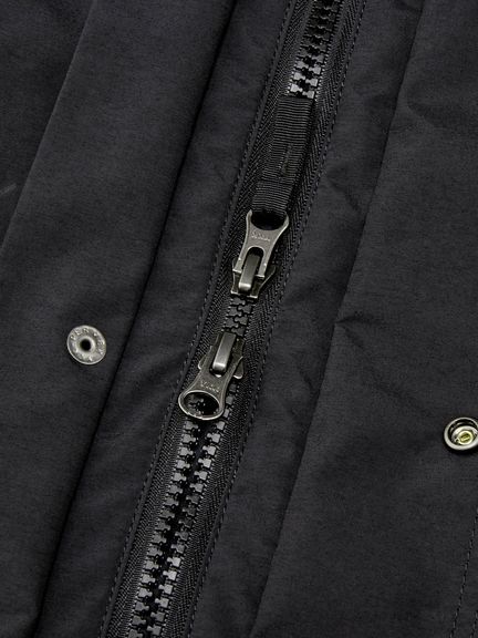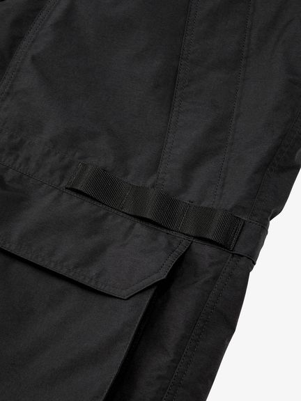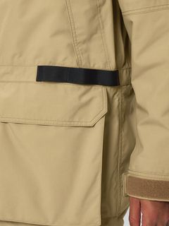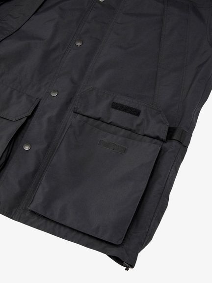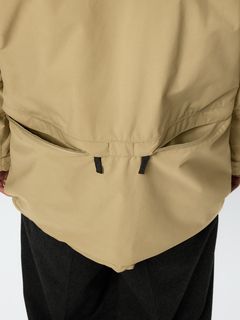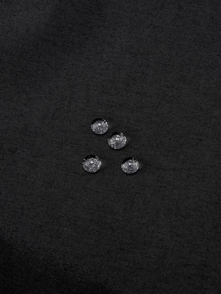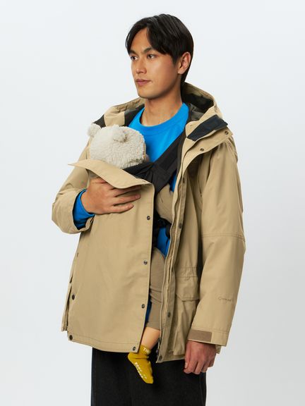 ベビーマグなどかさばる小物もしまえるフロントのマチ付きポケットや、ブランケットやおくるみを収納できる背面の大容量のポケットなど、合計10個のポケットを配置。収納を重視しつつ、ポケットにさまざまな育児用品を詰めても着膨れして見えないデザインに仕上げています。腰まわりには、カラビナでボトルやキャップを取り付けられるDカンやデイジーチェーンを配しています。ベビーカバーは、フロントのドットボタンで装着して抱っこに対応。単体でおむつ替えシートや敷物としても活用できます。非フッ素メンブレンによるePE GORE-TEX PRODUCTS 2層素材を採用。耐久性の高い70デニールリサイクルナイロンを表生地に使用しています。