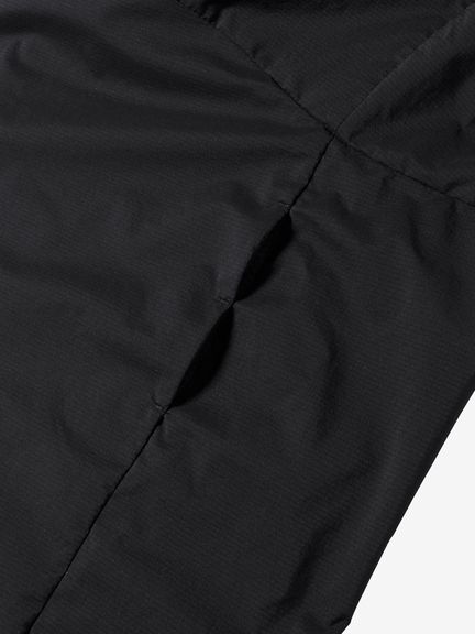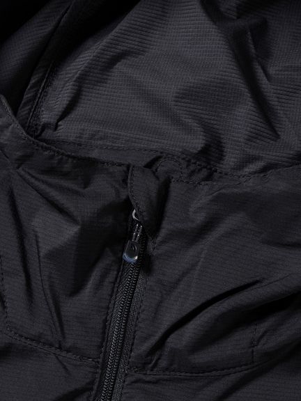 肌面はグリッド構造で、汗ばんだ肌が生地にまとわりつくことを軽減します。フードは片手でも調節が容易なワンハンドアジャスター仕様。メッシュポケットはベンチレーションを兼ねていて、右ポケット内部にセキュリティポケットがあります。フード裏のポケットに本体を収納できるパッカブル仕様。