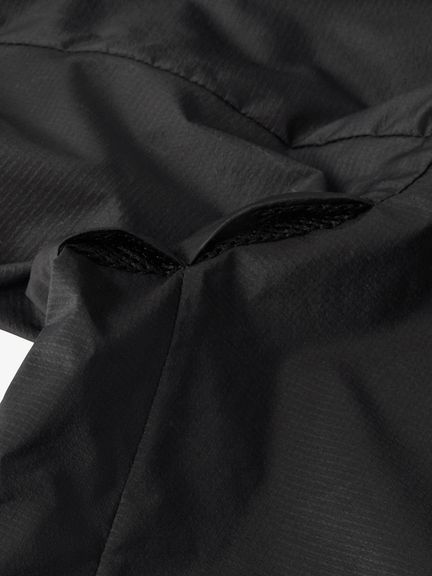 衣服内のムレを排出するベンチレーションは、生地の切替を利用したシンプルな構造で、背中と脇下に配置。さらに、ベンチレーションを兼ねる左右のファスナー付きポケットを装備し、ウエア全体の通気コントロール力を向上させています。フード裏に収納できるポケッタブル仕様で、コンパクトな携行が可能。