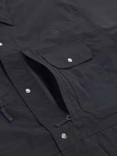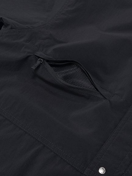 細番手の糸を高密度に織り込んだポリエステルの生地は、なめらかで上質な印象。適度なストレッチ性も持ち合わせています。生地にははっ水加工を施し、多少の雨や汚れに対応。フロントに3カ所のポケットを配置し、ファスナー付きポケットにはスマートフォンや財布などさまざまなアイテムを収納可能です。UVプロテクト(UPF50+、紫外線カット率95%以上)機能付き。