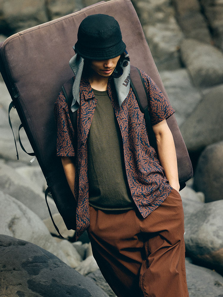 ラフさや遊び心を総柄で表現したクライミングシャツ