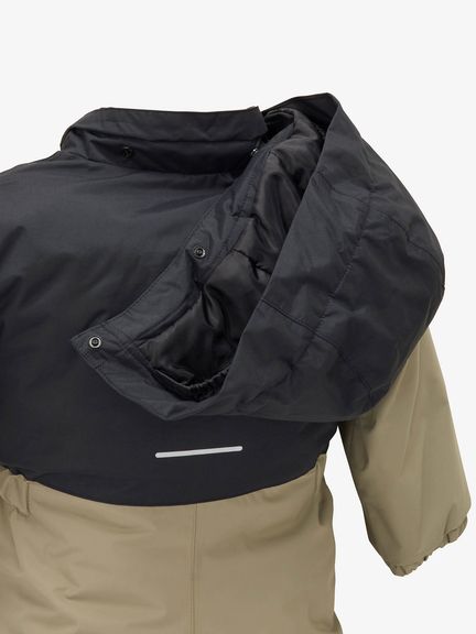 - 着脱しやすいように股ファスナー仕様/腰部にリフレクトプリント/取り外し可能なフード/記名ラベル付き/ロゴ刺繍