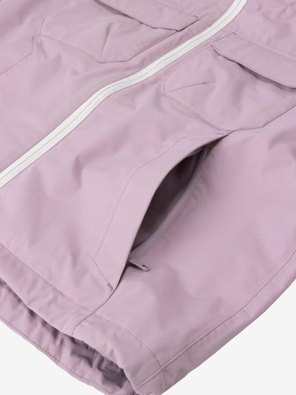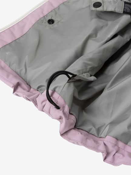 表地には防水透湿性に優れたナイロン2層構造を採用。脇下にベンチレーションファスナーを設け、衣服内温度を素早く調節できます。両胸にフラップ付きポケット、両サイドにファスナーポケットで収納力を高め、左袖にはICリフト券など小物を入れるのに便利なファスナーポケットを配置。ヘルメット対応のフードは取り外しが可能です。内側にスノーカフが付き、裾はドローコードでフィット感の調整ができます。