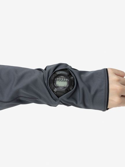 やや長めに設定した袖はサムホール仕様で、袖をめくることなく腕時計の表示が確認できるウォッチウィンドウを両腕に装備。銀イオンによるポリジン・ステイフレッシュ加工の抗菌防臭性を備えています。通気を考慮したややゆとりのあるシルエットで日常のランニングに着用しやすく、暑い時期の快適さを高めてくれるアイテムです。