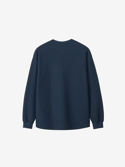 凹凸のあるワッフル生地特有の通気のよさが特徴で、生地と体の間に空気の層を作り出し体温を逃がしにくいため、暖かさも確保。肌面に起毛を施すことで柔らかな肌触りとしなやかな着心地を追求しています。リサイクルポリエステルとポリウレタンを混紡した生地は適度なストレッチ性を備え、洗濯もしやすいイージーケア。