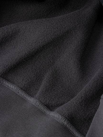 表側は高収縮ポリエステルスパン糸による天然調のナチュラルな表情。肌面は異型中空断面糸を用いた裏起毛を採用することで、やわらかな風合いとふくらみを備えつつ適度な軽量性と保温性を実現。