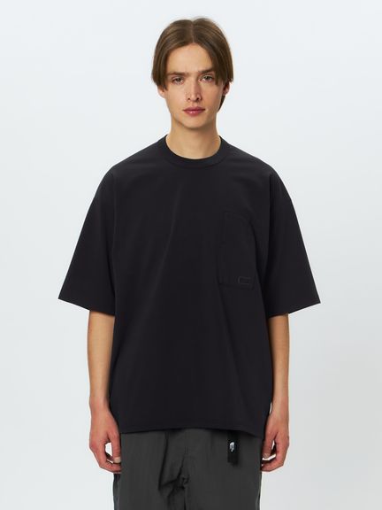 生地の表面には高収縮のスパン糸を採用。天然素材のような風合いとストレッチ性を備えています。肌面にははっ水糸を使用することで、汗をかいても肌離れがよく、肌面をドライに保ちます。ハーフドーム型の胸ポケットはサングラスなどが収納できるサイズ感。ポケット入口の位置と大きさは、収納したものが落ちにくい設計です。胸ポケットには刺繍のワッペンロゴ、背面裾部分にはリフレクトの転写ロゴプリントを配置。UVプロテクト(UPF50+、紫外線カット率95%以上)機能付き。繊維に付着したバクテリアの繁殖を抑えて、汗によるにおいの発生を抑制するポリジン・ステイフレッシュ加工を施しています。