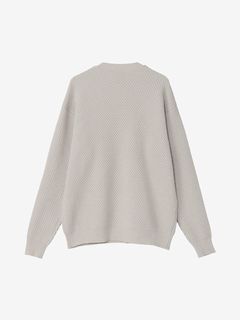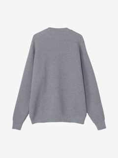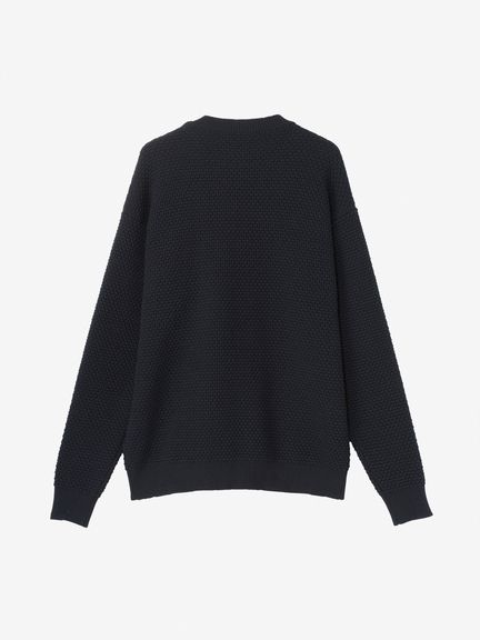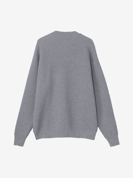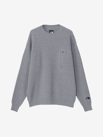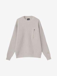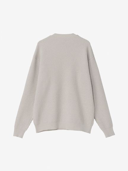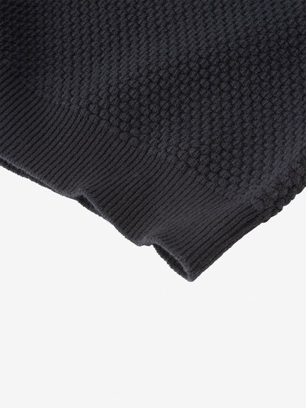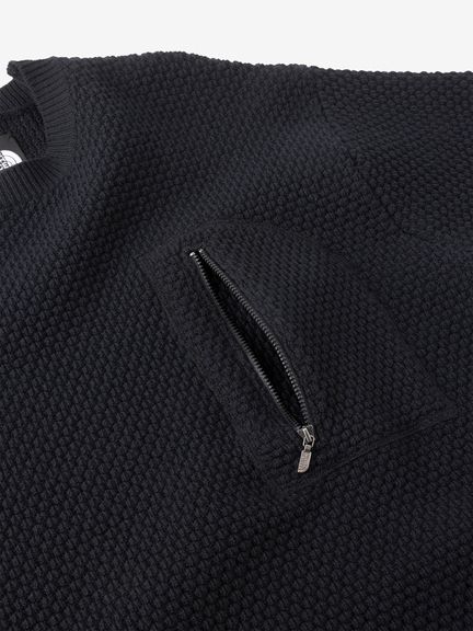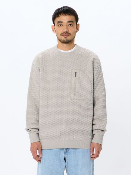 凹凸感のある立体的な編地が魅力。ハーフドーム型の胸ポケットはサングラスなどが収納できるサイズ感。ポケット入口の位置と大きさは、収納したものが落ちにくい設計です。