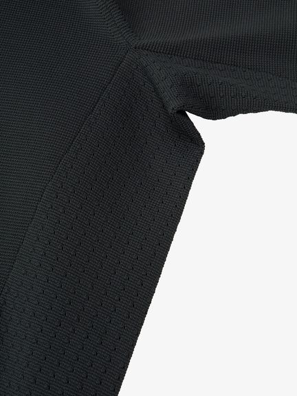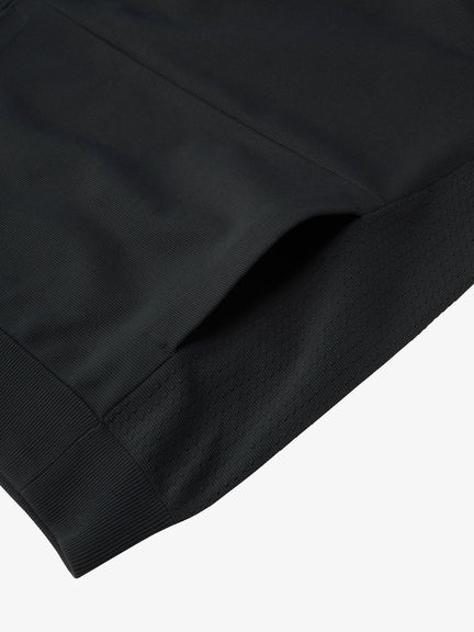 メインに採用したポリエステル素材のニット生地は、しなやかに伸縮して体の動きに追従。脇はメッシュ調の編地に切り替えて、運動中の衣服内のムレを排出します。両サイドには小物の収納に便利なポケットを装備。UVプロテクト(UPF50+、紫外線カット率95%以上)付きで、強い日差しにも対応します。