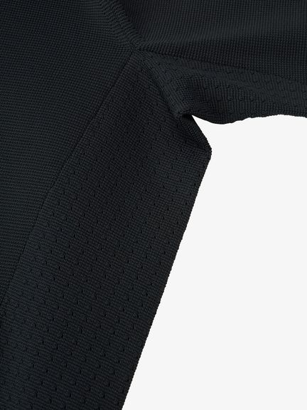 メインに採用したポリエステル素材のニット生地は、しなやかに伸縮して体の動きに追従。脇はメッシュ調の編地に切り替えて、運動中の衣服内のムレを排出します。UVプロテクト(UPF50+、紫外線カット率95%以上)付きで、強い日差しにも対応。