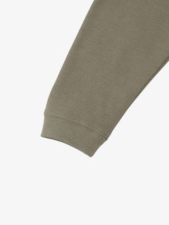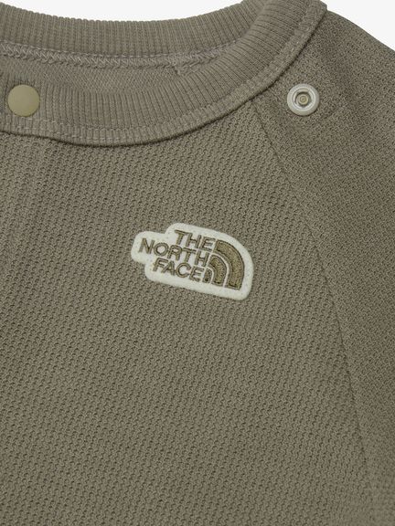 「ラッチ」とは編み機の針の部品のこと。ラッチ部分の針を使って飛ばし編みをすることで、短いパイル組織を形成しています。ロンパースは脱ぎ着がしやすいドットボタン仕様で、股部分は掛け違いを防止するカラープラドットボタンを配置。スタイはドットボタンでロンパースに直接装着するタイプで、赤ちゃんが寝ている状態でも前から簡単に付け外しができます。