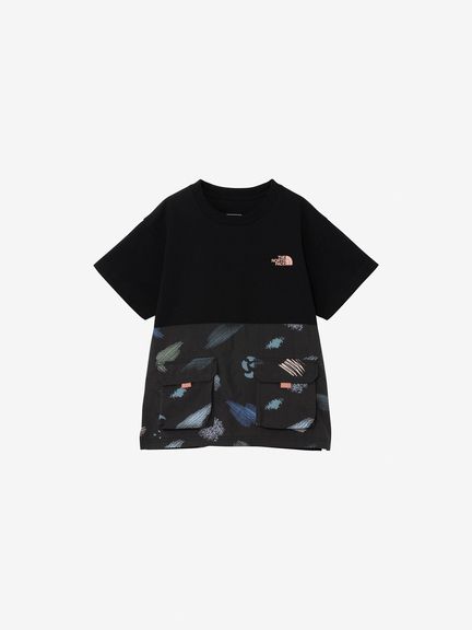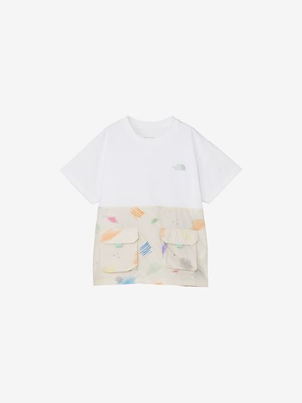 アイテムを収納したり、見つけたものを詰め込んだり、子どもたちの冒険に役立つポケットを備えたTシャツのキッズモデル