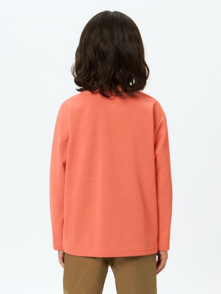 やわらかな肌触りのニット素材は、光の透過を抑えるセラミック粒子を含有した糸を採用することで、遮熱性を向上。ダブルニット構造により、通気性を高めています。ダブルニットの表面は高濃度セラミック糸を使用した天竺組織、裏面はポリエステル糸を使用した鹿の子組織で吸水性と肌離れのよさを実現。UVガード(UPF30-50+、紫外線カット率90%以上)機能付き。左胸にポケットを配置しています。