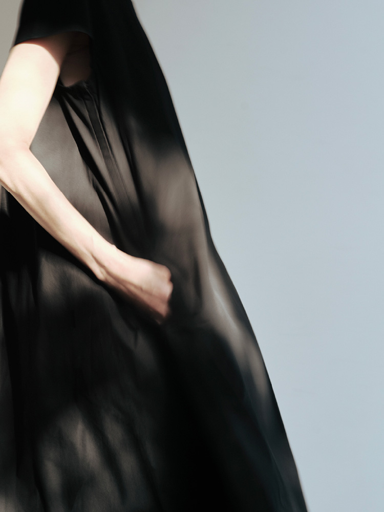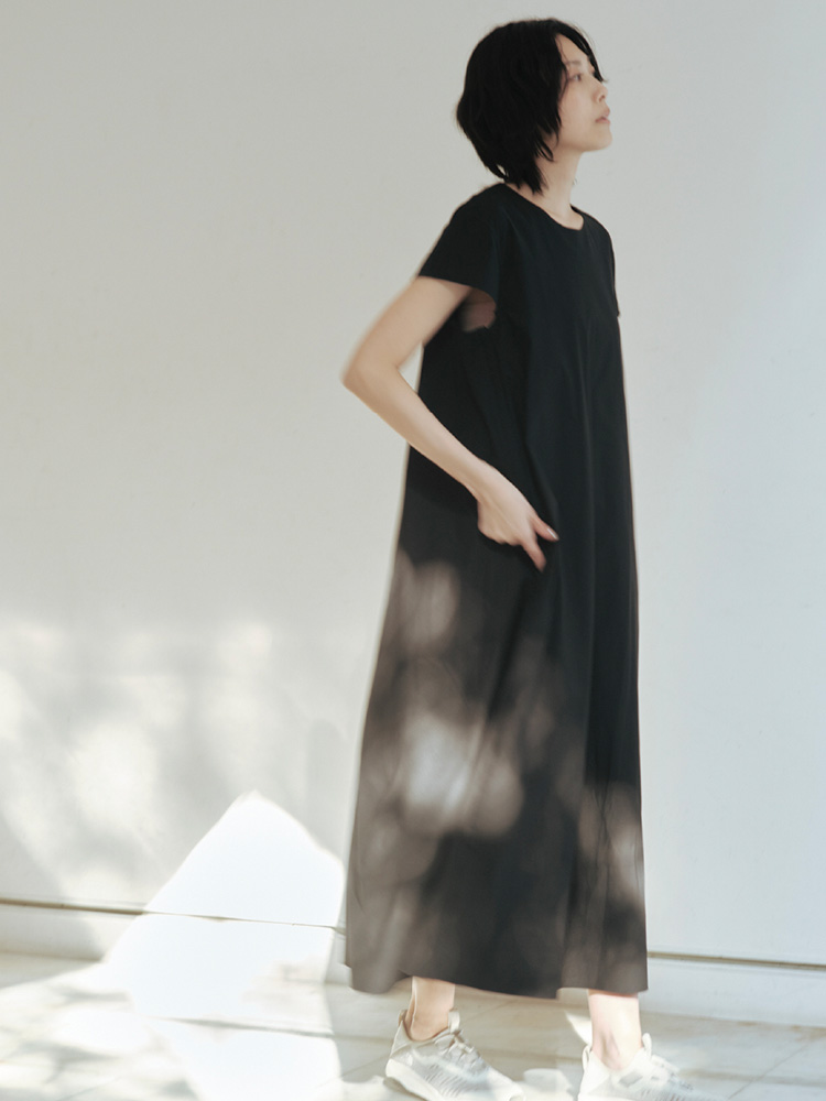 授乳対応、産前産後継続的に着用できる、しなやかなドレープ感のある布帛ライクなニットワンピース