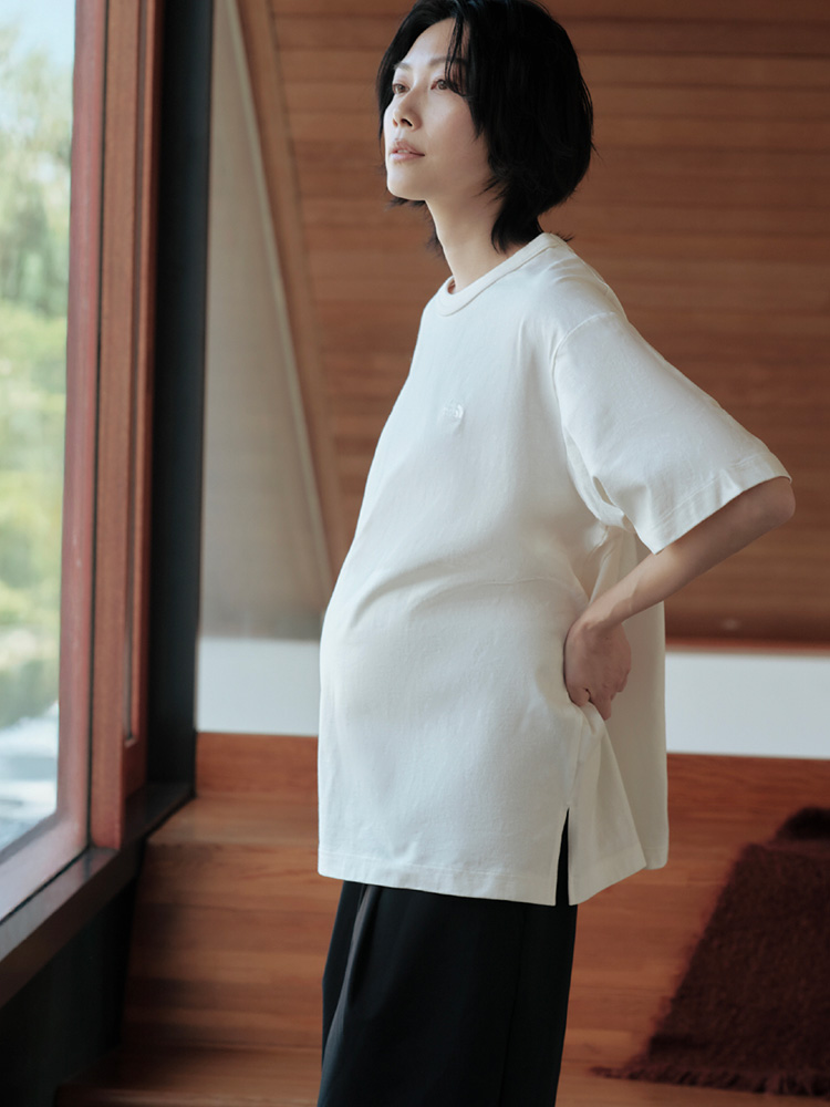 左胸に配置したロゴ刺繍がデザインのアクセント。妊娠中から産後まで、長期間着用できる1着です。