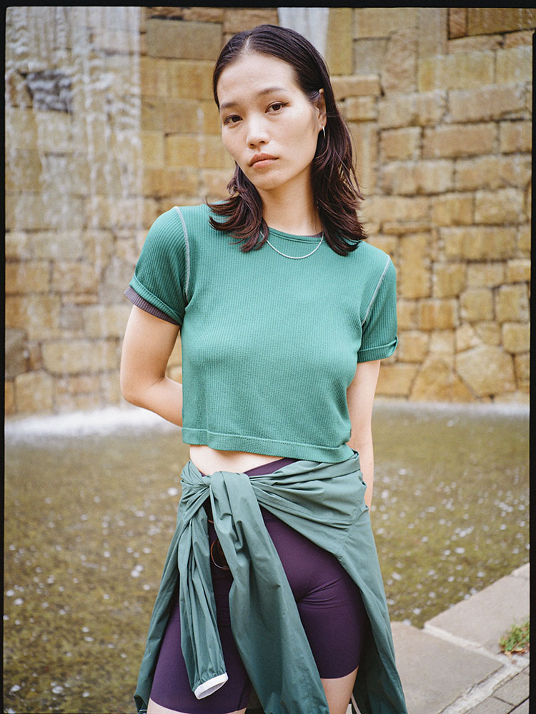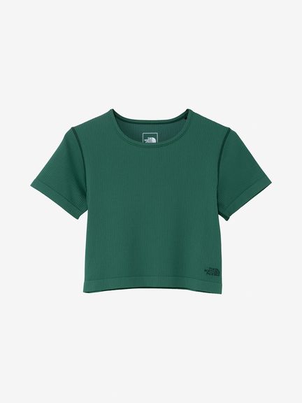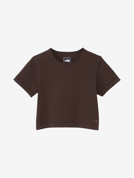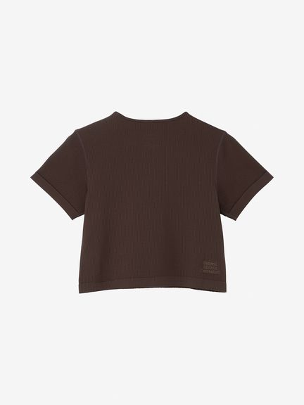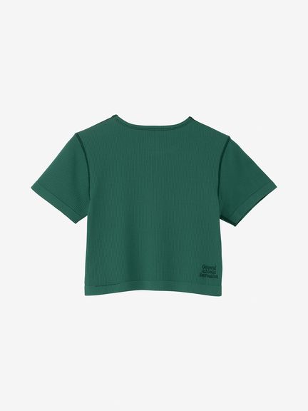 縫い目を極力減らし、着用時の肌当たりに配慮したリブ編みニットの半袖Tシャツ