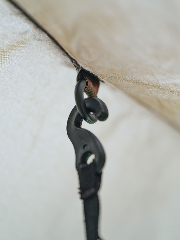 - ダブルウォールのアウトフレーム構造/吊り下げ式のインナーテント/EVABASE 6と連結可能/大きなベンチレーション/ハンギングループ/スノースカート/ダッフル型の収納ケース
