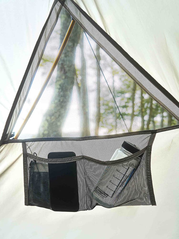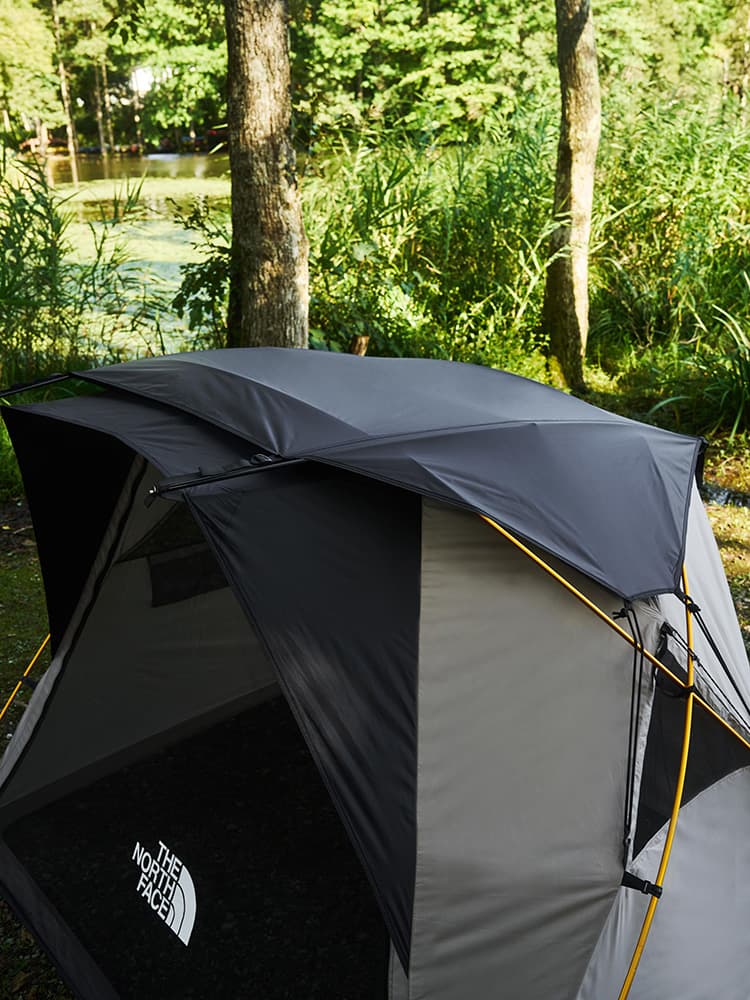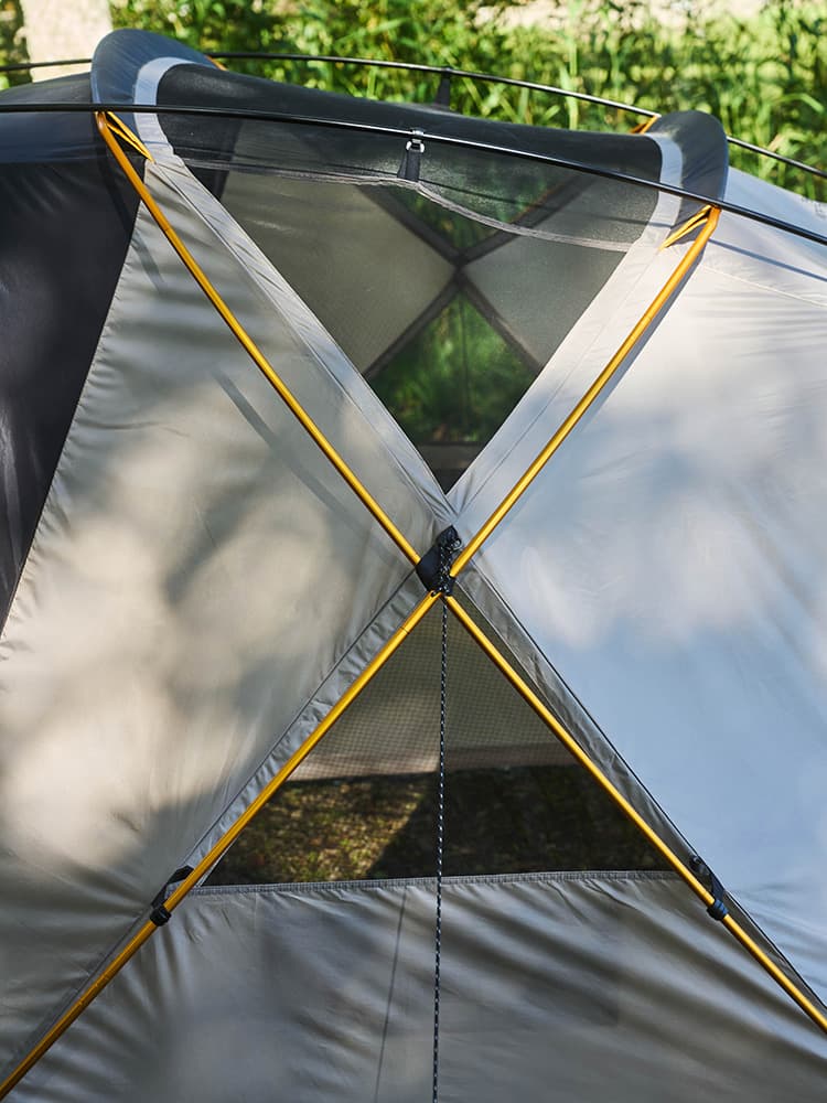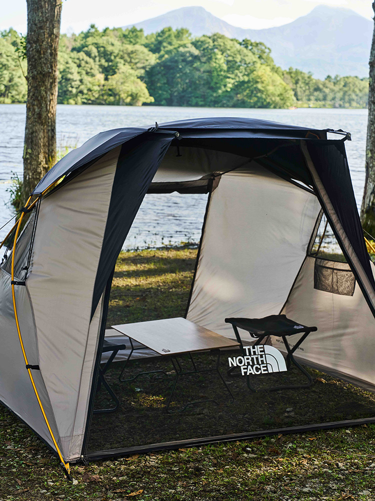 室内は、キャンプチェア2組を置いて使用してもリラックスできる広さで、天井部とサイドのメッシュウィンドウで開放的な空間にデザイン。フロアレス仕様ですが、後ろの一部は荷物を置けるようにフロアを備えています。別売のフットプリント(NN32500)を使用すると、ピクニックスタイルも楽しめます。フロントにはフルメッシュを配置して、通気性を確保。暑い日には後部もメッシュにすることで、室内を風が通り抜けるようになります。2本のポールを2カ所で交差させたうお座構造は、耐風性が高く安心して使用可能です。