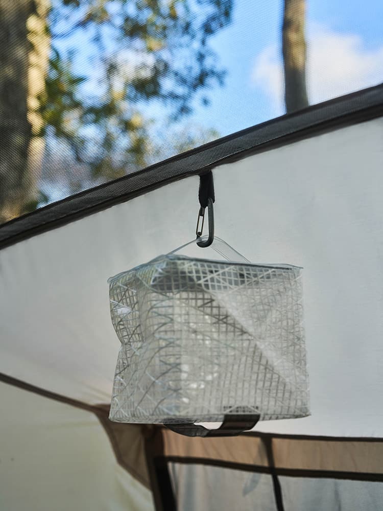 強い日差し対策として、裏面に遮光PUコーティングを施したルーフプリントを付属。フロントパネルのメッシュのロゴに太陽光などが当たると、室内に隠れロゴが出現。日除けとして公園や、ビーチ、デイキャンプでの使用におすすめで、暑いシーズンでも涼しく開放的に過ごせるシェルターです。