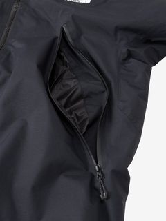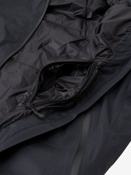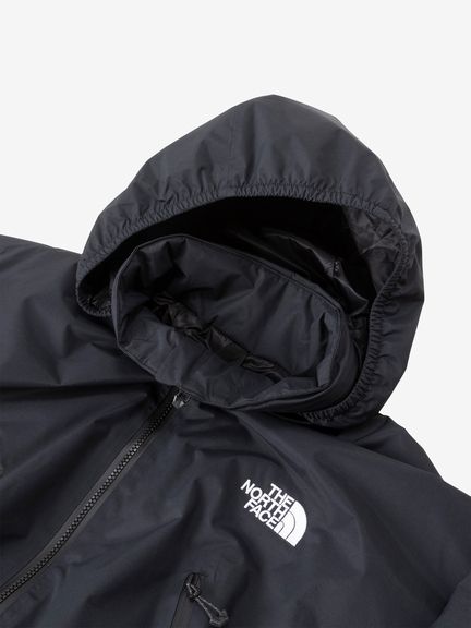 表地には、防水透湿性に優れたHYVENTを採用し、身頃と袖にはプリマロフトわたを封入し保温性も高めています。フードは襟に収納できるビルトイン仕様で、携行時にもかさばりません。フロントは止水ファスナーを採用し、雨の浸入を抑えます。左右に大容量のファスナーポケットを備えており収納力があり、ジャケット本体をコンパクトに収納できるスタッフサック付きで携行にも便利です。