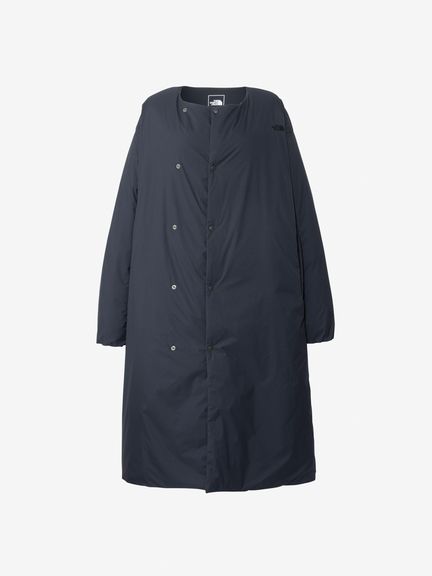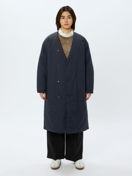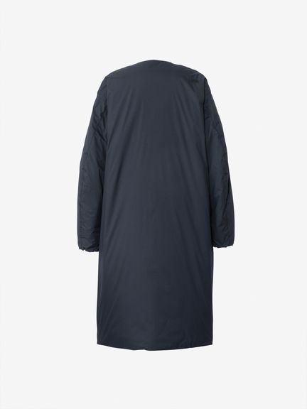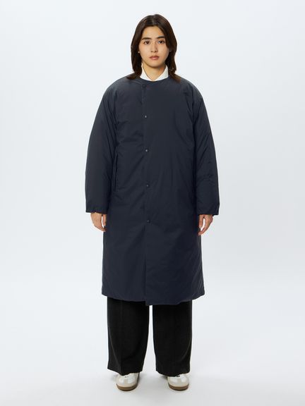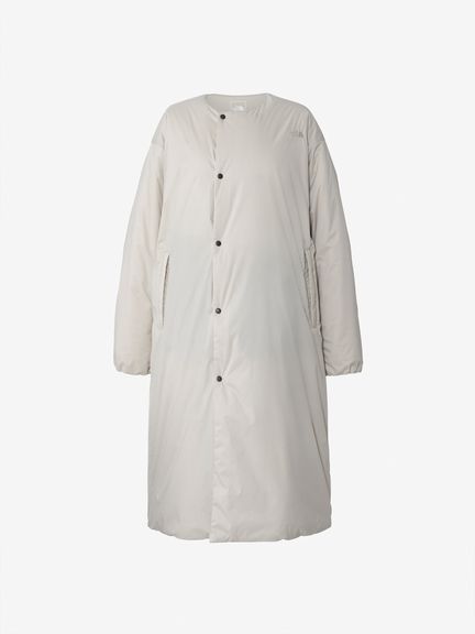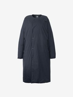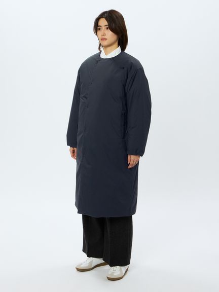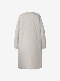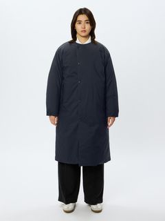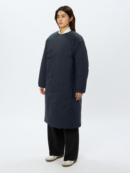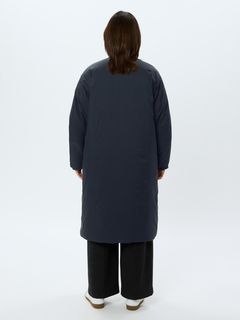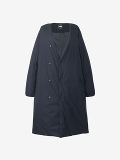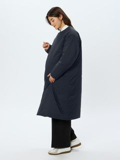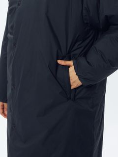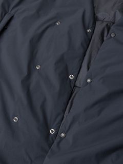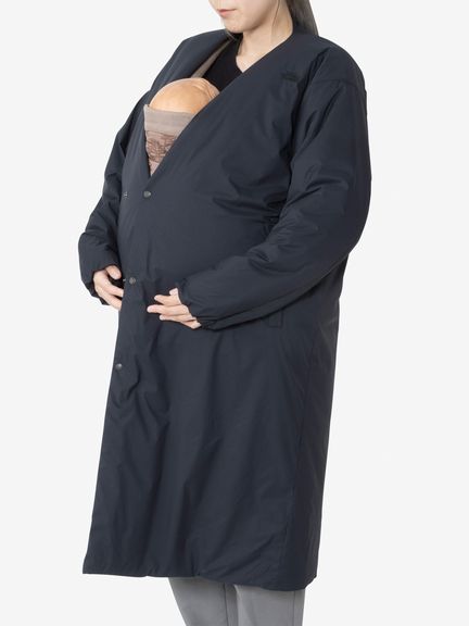 2列に配置したフロントのドットボタンにより、身幅を変えることが可能。お腹のサイズに合わせてシルエットを変えられます。小さな子どもを抱っこするときも、子どもの上から無理なく羽織ることが可能。襟元から子どもの頭を出すことを想定し、Vネックにもできる2WAY仕様です。表地は強度のあるリップストップナイロン素材。生地にはっ水加工を施し、多少の雨や汚れに対応します。中わたは軽量で密度のある中わた・HEATSEEKERで保温性を高めています。