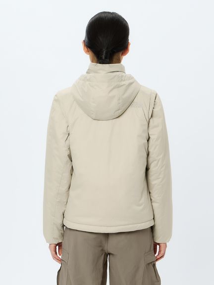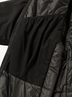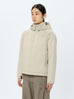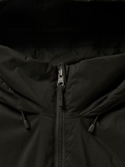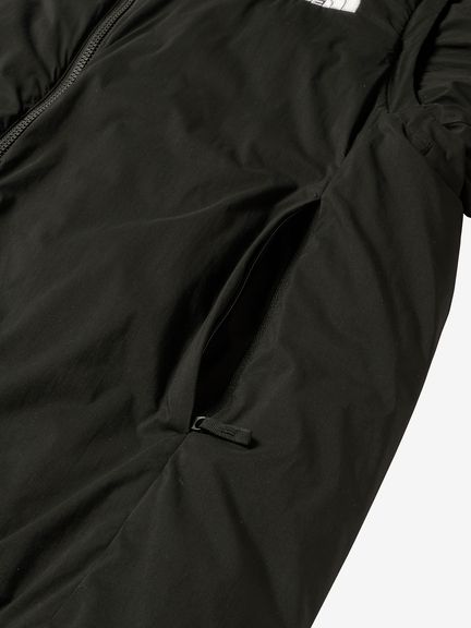 断熱効果の高いエアロゲルを練り込んだ中わたは薄手でも保温性が高く、着心地の軽さも魅力です。袖が取り外せるコンバーチブル仕様で、ベストとしての着用が可能。コンバーチブル部分の脇下のドットボタンを外せばベンチレーションにもなります。さらに、ジップインジップ対応ジャケットに取り付けることも可能。表地ははっ水加工を施したリップストップナイロンで、多少の雨や雪に対応します。フードはビルトイン仕様。
