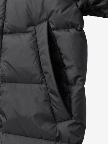 特徴的なディティールとして、着脱可能なフードが備えられており、多少の雨に対応します。また、ダウンは、650フィルパワーのリサイクルダウンを採用しています。ダウン80%フェザー20%の4層ダウンパック構造で、保温性を高めダウンの吹き出しを軽減します。脇のビッグポケットは、サイズの大きな雑誌や資料などの出し入れが容易にでき、利便性にも優れています。