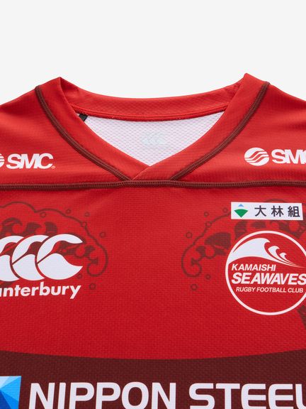 NTTジャパンラグビー リーグワン2025-26の日本製鉄釜石シーウェイブスの新1STレプリカジャージーです。ジャージーカラーの「赤」は、これまでの歴史に対する尊重を表現しており、ボディにあしらわれた波の柄は釜石ラグビーにとっての象徴である「富来旗(ふらいき)」の波を模したデザインとなっています。昨シーズン同様に「船出の帆」「羽ばたきの翼」をモチーフとした釜石鵜住居復興スタジアムの屋根幕を胸元に施し、地域のシンボルを目指していくというチームコンセプトを表現したデザインになっています。