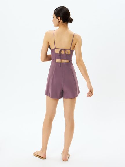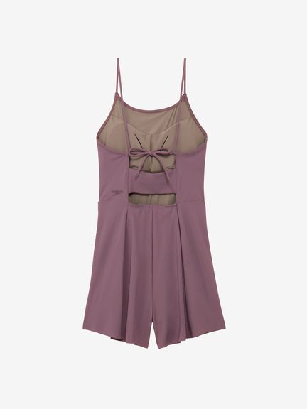 フロントはシンプルで洗練された雰囲気。背面は華奢な肩ひもでバックコンシャスなデザイン。裾に向かってAラインにやや広がるシルエットは、ヒップラインを程よくカバーし、美脚効果も期待できます。差し込みタイプのカップ付き。UVケア(UPF15-30、紫外線カット率85%以上)機能付き。