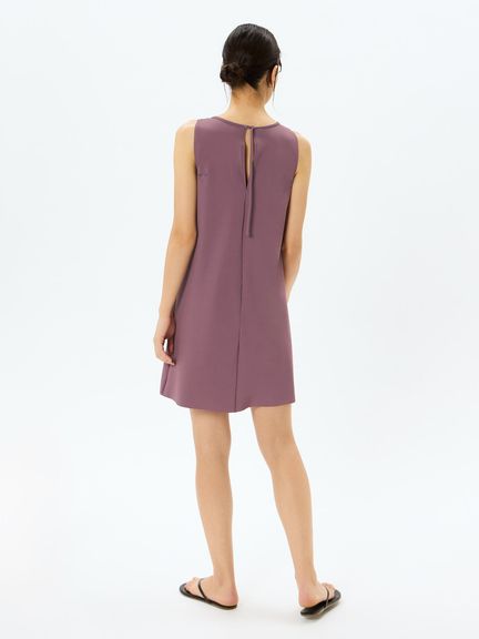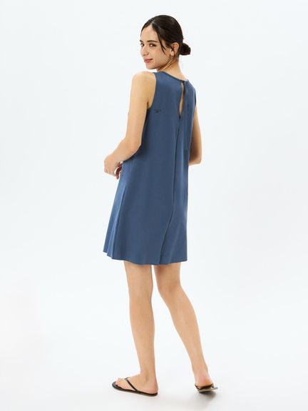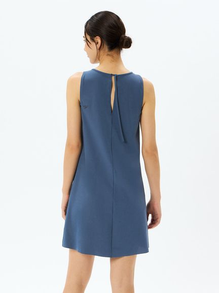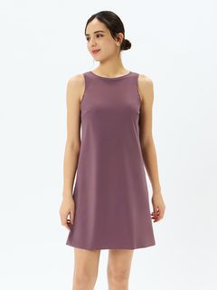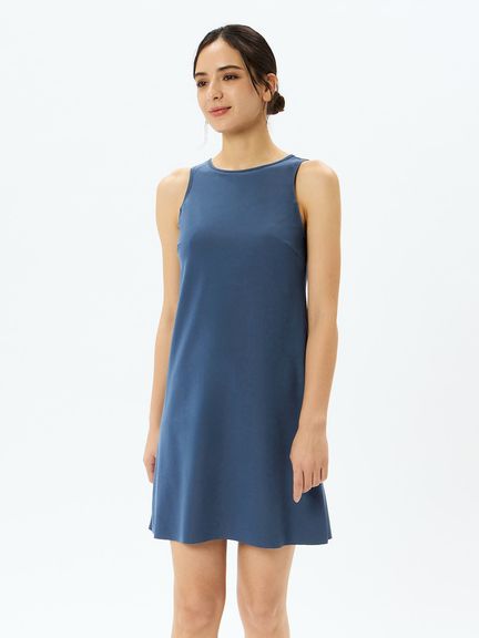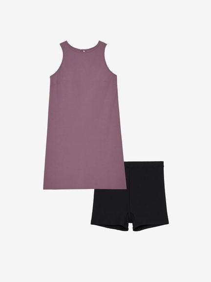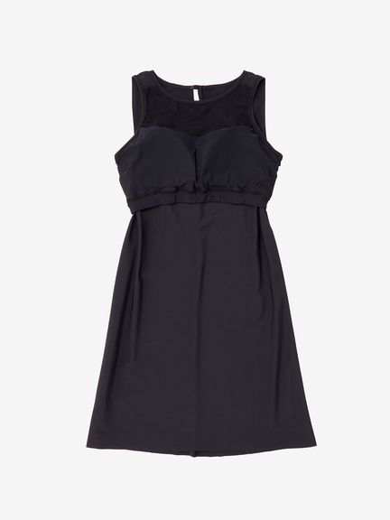露出を控えた高めのネックラインで、裾に向かってふんわり広がるAラインシルエットがボディラインをさりげなくカバーします。後ろ襟ぐりの開きを調節できるホック付き。差し込みタイプのカップ付きです。カップインナー付きなので、一度の袖通しでスタイルが完結します。インナーにメッシュ素材を用いることで水はけよく、軽量化を図りました。