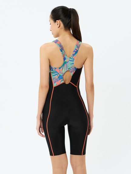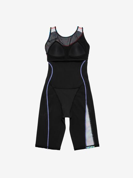 露出を抑えた小さな背穴。肩ストラップは食い込みを軽減するために幅広仕様です。着脱時のもたつきが少なくズレにくく動きやすい、縫い込み式のカップ付き。クロッチ部分には肌あたりのよい柔らかな素材を使用しています。股下のハギをなくし、スムーズな脚の動きを実現しました。膝上までの4分丈です。安心感のある厚みがボディラインをほどよくカバーします。ゆったりとしたフィット感で、着脱時もトレーニング時も快適性が持続します。はっ水機能付き(非フッ素はっ水)。UVガード(UPF30-50+、紫外線カット率90%以上)機能付き。