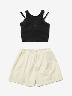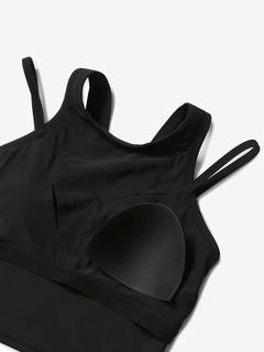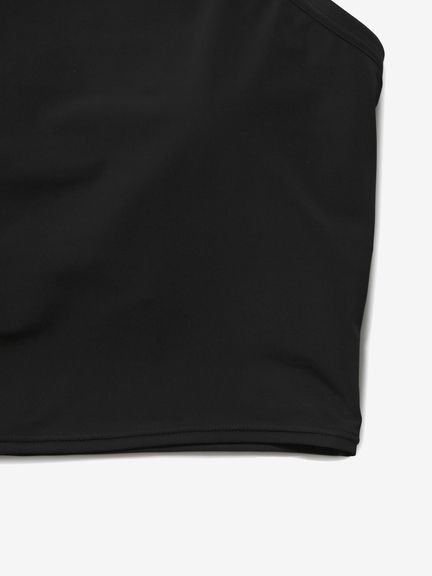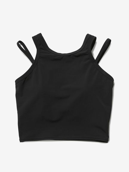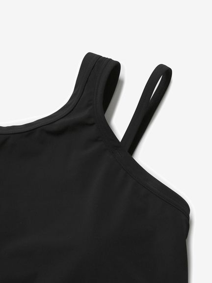 トップスはリサイクルナイロン糸を使用した環境配慮型素材SensitiveReco(センシティブ レコ)」を採用。アメリカンスリーブタイプのタンクトップに華奢なストラップのデザインが新鮮。