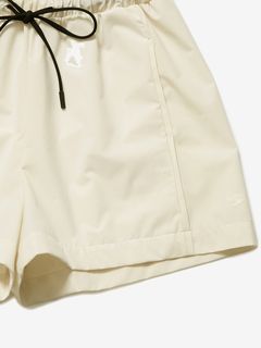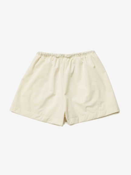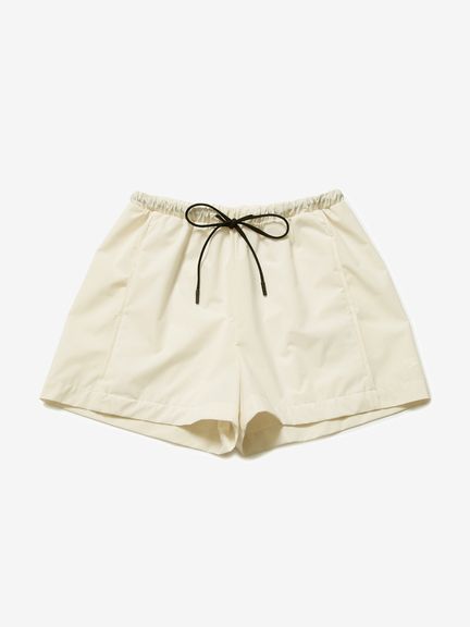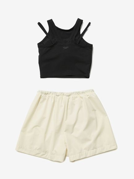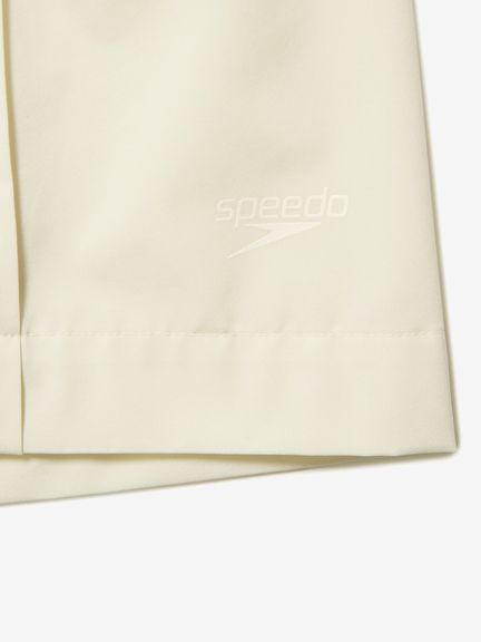 ショーツは布帛素材で、はっ水加工を施しておりプールではもちろんタウンユースとしても雨や汚れを気にせずに着用いただけます。UVケア(UPF15-30、紫外線カット率85%以上)機能付き。