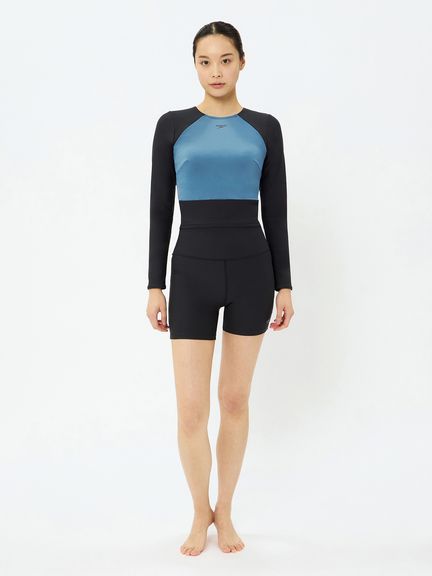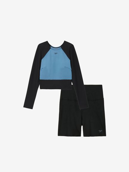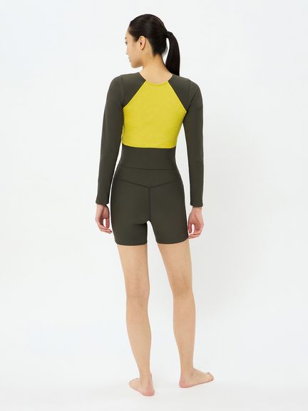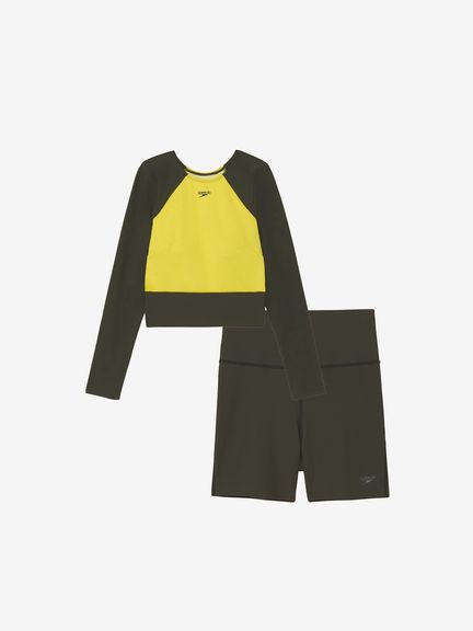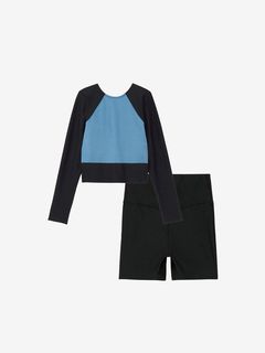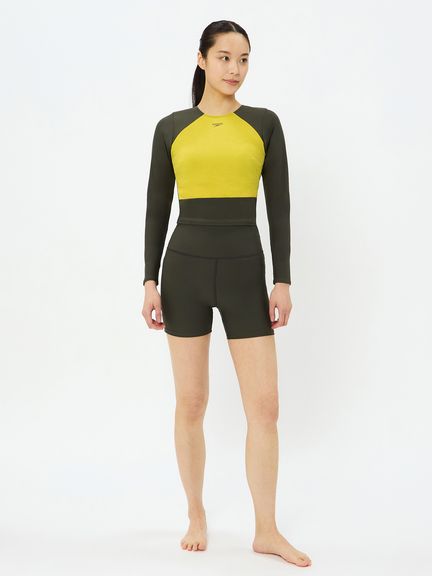 トップスはソフトなストレッチ性が特長の環境配慮型素材を採用。ロングスリーブ仕様でUV対策をしています。UVケア(UPF15-30、紫外線カット率85%以上)機能付き。アクティビティに集中できる露出控えめのデザイン。差し込みタイプのカップ付きで、これ一枚で完結。着脱しやすいUバック。