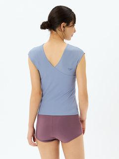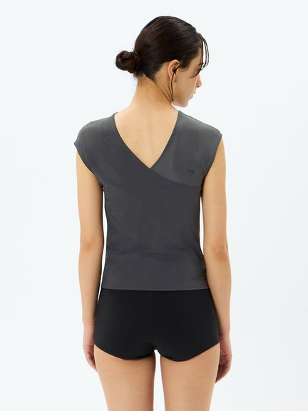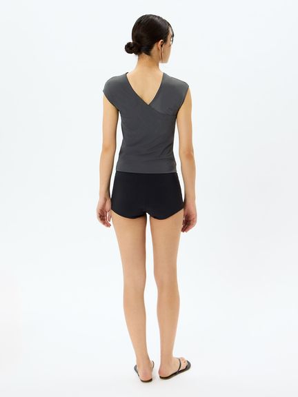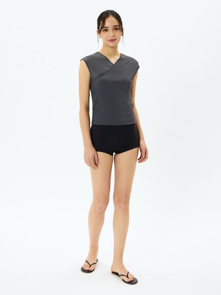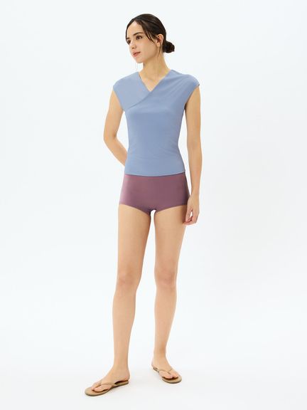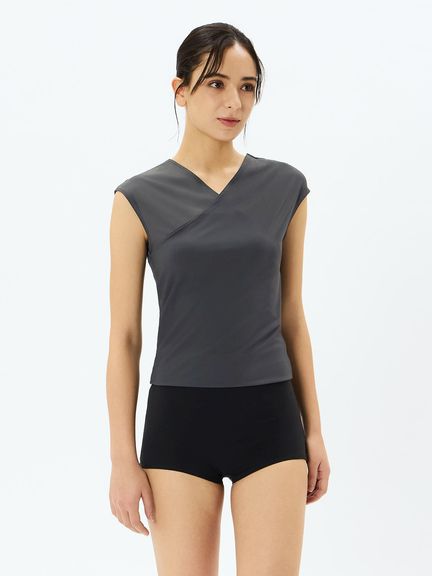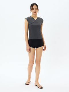 レイヤーするトップスは裾で折り返してカシュクールにするデザイン。気になるお腹まわりをすっきりカバーしてくれます。重ねあわせたトップスからインナーのブラトップがちらりと見えることも◎。片方だけ袖を通し、ワンショルダートップスとしてルーズにあわせるコーディネートもおすすめです。