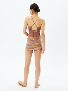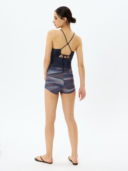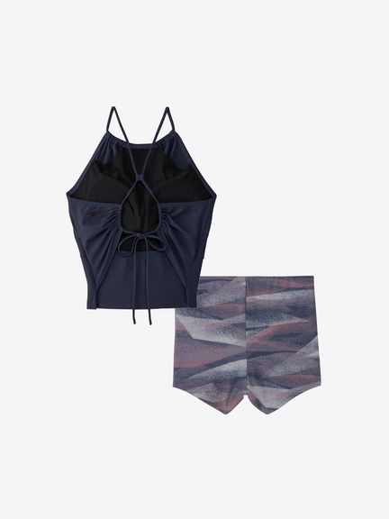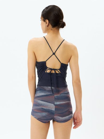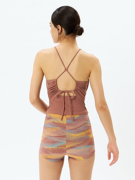 トップスは鎖骨部分をチラ見せにして、肩回りをスッキリ華奢に見せます。繊細なストラップを用いたバックスタイルがヘルシーな印象。ストラップの合わせ位置が可動でき、フィット感を調整できます。差し込みタイプのカップ付き。2025 1st シーズンのLANAグラフィックのボトムスは、ハイウエスト使用で脚長・脚痩せ効果が狙えます。
