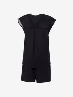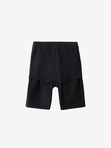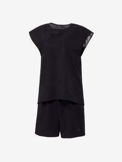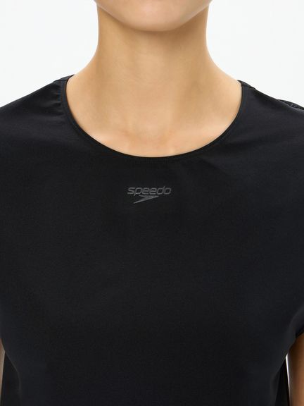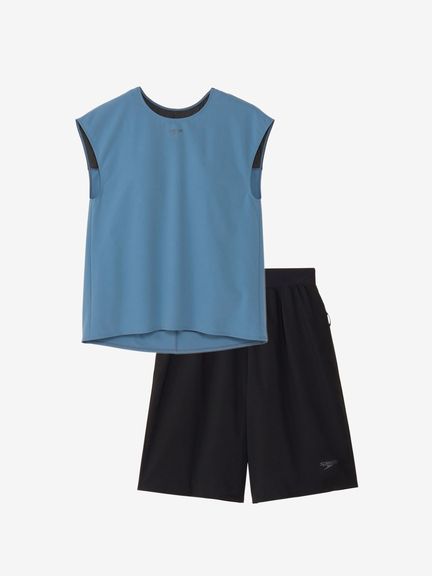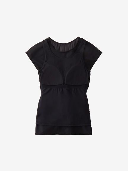 トップスは2枚構造で、肩先まで隠れるフレンチスリーブが二の腕をカバーし、インナーをウエストインできるのでめくり上がりによる露出を軽減。インナー背面は肩を動かしやすいYバックで、軽量&水抜けのよいメッシュ生地を重ねたデザインが、バックスタイルの美しさと露出の軽減を両立しています。ボトムスも2枚構造で、フィット感のあるインナー付き。膝上丈で露出を抑えています。差し込みタイプのカップ付き。UVガード(UPF30-50+、紫外線カット率90%以上)機能付き。
