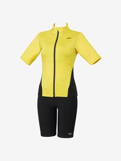 トップスはソフトなストレッチ性とボディラインを拾いすぎないハリ感、軽量感が特徴の環境配慮型素材「Heather Stretch Pro(ヘザー・ストレッチ・プロ)」を採用。半袖タイプで気になる二の腕をカバー。フロントのウェービーライン&スタンドカラーにより、肩まわりはすっきりコンパクトな印象です。ウエストから裾にかけての切り替えデザインがウエストの位置を高くし、脚を長く見せます。背面中央の水抜け用メッシュ切り替えにより、水中での動きやすさを実現しました。差し込みタイプのカップ付きで、これ一枚で完結。着脱もカンタンです。