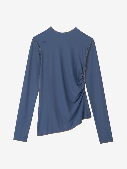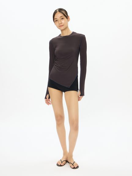 ストレッチ性に優れた極薄の生地感と、心地よい肌触りがまるで第2の肌のよう。サイドにギャザーを施しているため、一枚で表情豊かな印象になります。水着の上からぱっと着用したり、手持ちのボトムスに合わせて洋服として着まわしたり、使い方はいろいろ。軽量で小さく持ち運べるため、旅先にあると重宝する一枚です。