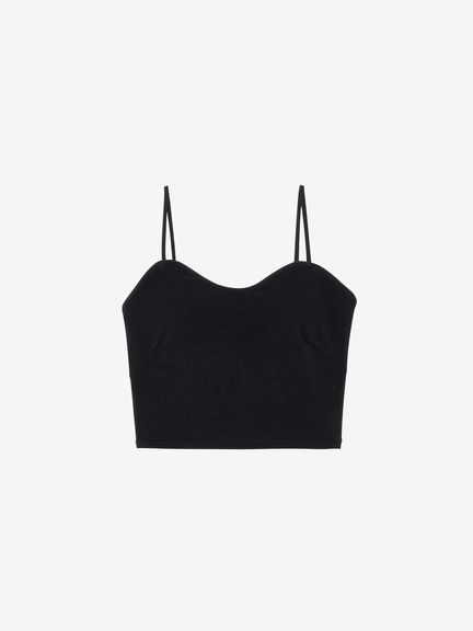 デコルテを美しく見せるカットライン。華奢な肩ストラップと開いた背中がヘルシーな印象です。一見シンプルに見えますが、女性の美しさを際立たせるこだわりが詰まった一枚です。着脱時のもたつきが少なくズレにくく動きやすい、縫い込み式のカップ付きです。