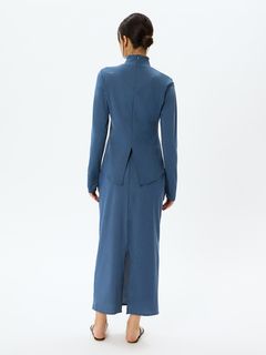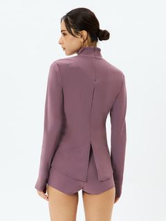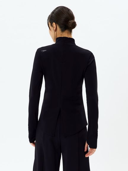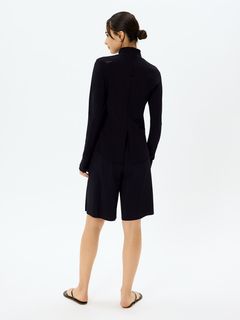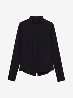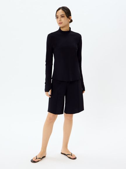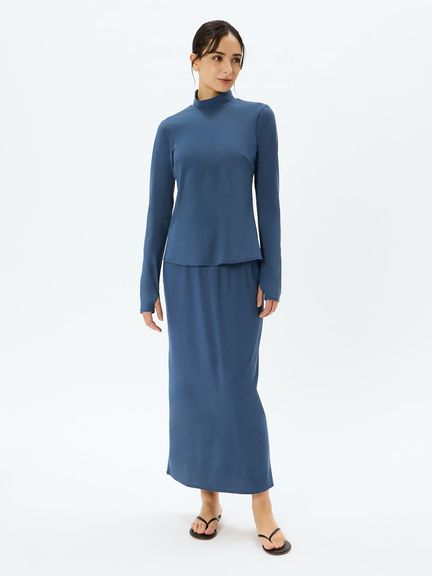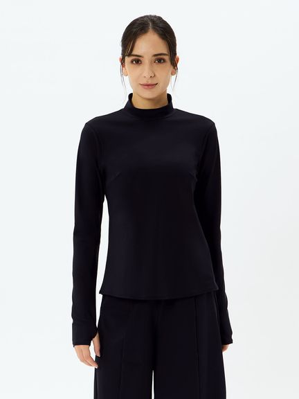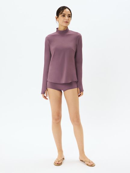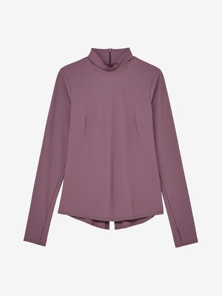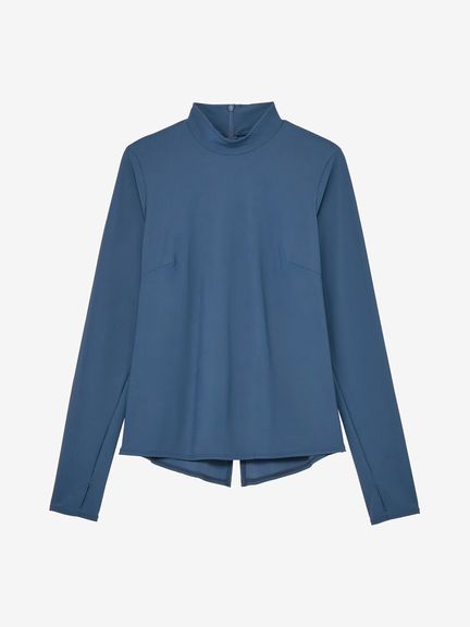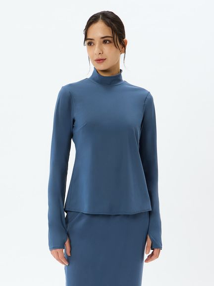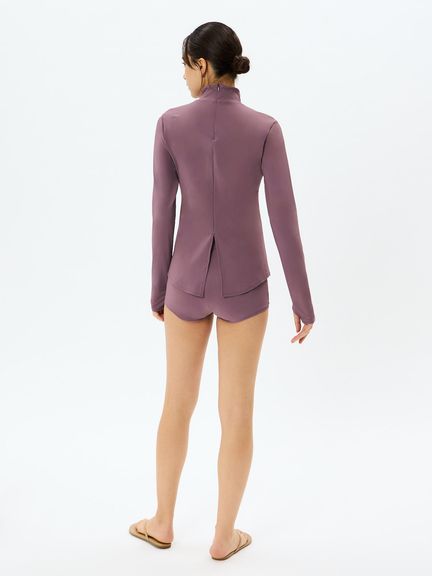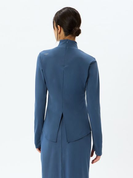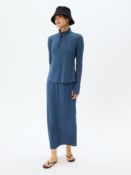 首元のUVケアもできるハイネックデザインで、バスト下から裾にかけての絶妙なラインが美しいボディラインを演出します。バックスリットがこなれた印象。シンプルながらもこだわりが詰まった一着です。