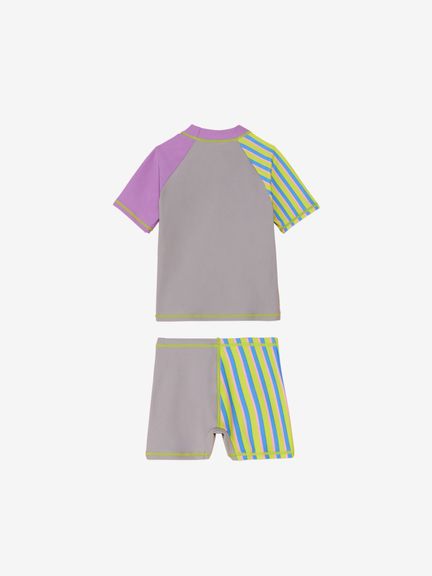 爽やかな夏の景色をイメージしたシルバーとマルセイユブルーの2カラーをご用意。トップスは首まわり高めで日差しをガード。イン/アウト、どちらでもスッキリ着こなせるデザイン設計です。ボトムスはサイズ調整できるスピンドル付きです。プール、水遊びはもちろん、アウトドアや公園遊びでもお使いいただけます。