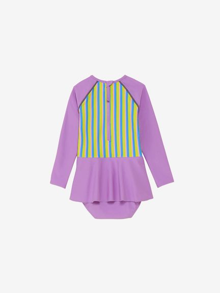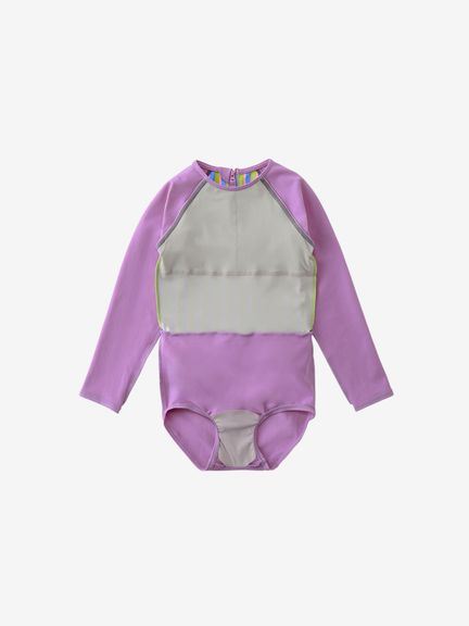 透けにくい厚みと柔らかな風合いを実現した環境配慮型素材「ENDURANCE ECO(エンデュランス・エコ)」を採用しています。4WAYストレッチ素材で、小さなお子さんが思い切り遊んで、たくさん泳いでも安心です。ポリウレタンを使用していないため塩素に対する耐久性があり、おさがり需要に重宝します。ロングスリーブ仕様で日差しから肌を守ります。UVプロテクト(UPF50+、紫外線カット率95%以上)機能付き。