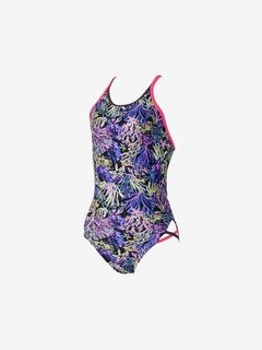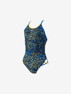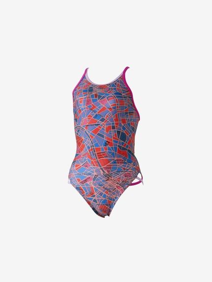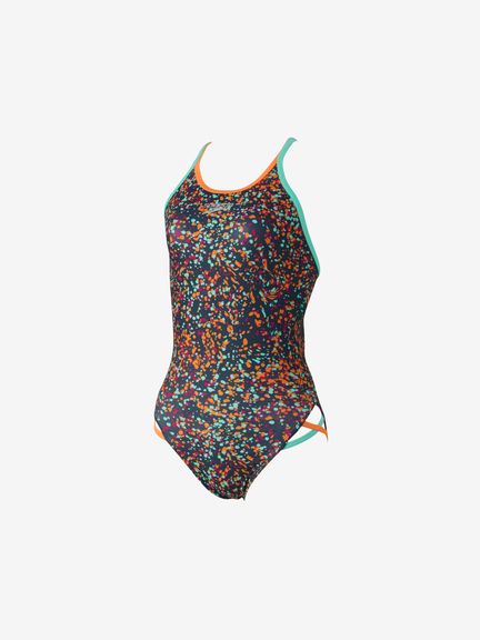 スリットにほどこした2トーンのクロスデザインは、ヘルシーで可愛らしい雰囲気。ネックラインは水の浸入を防ぎつつ、鎖骨をきれいに魅せるデザインになっています。肩ストラップはほどよい厚みのダブル仕様で安心の着用感。別売りのカップを使用できるフック受けが付いています(※カップは付属しておりません。SpeedoのハンギングスイムカップSE32001がオススメ)。総裏地付き。