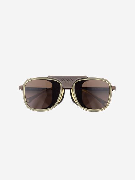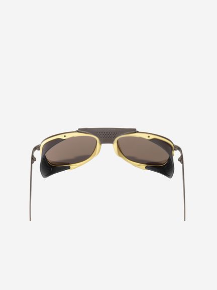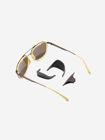 プレミアムシリーズとアルパインシリーズを融合したハイエンドコレクションで、レトロな雰囲気がSUNSKIらしさを際立たせます。スチールフレームではこめかみに当たって着用感が気になる場合がありますが、本モデルはこめかみ部分をやや広めに設計し、装着時の圧迫感を抑える配慮をしています。サイドシールドとセンターピースを取り外すとプレミアムコレクションの佇まいになり、普段使いにも馴染む仕様です。