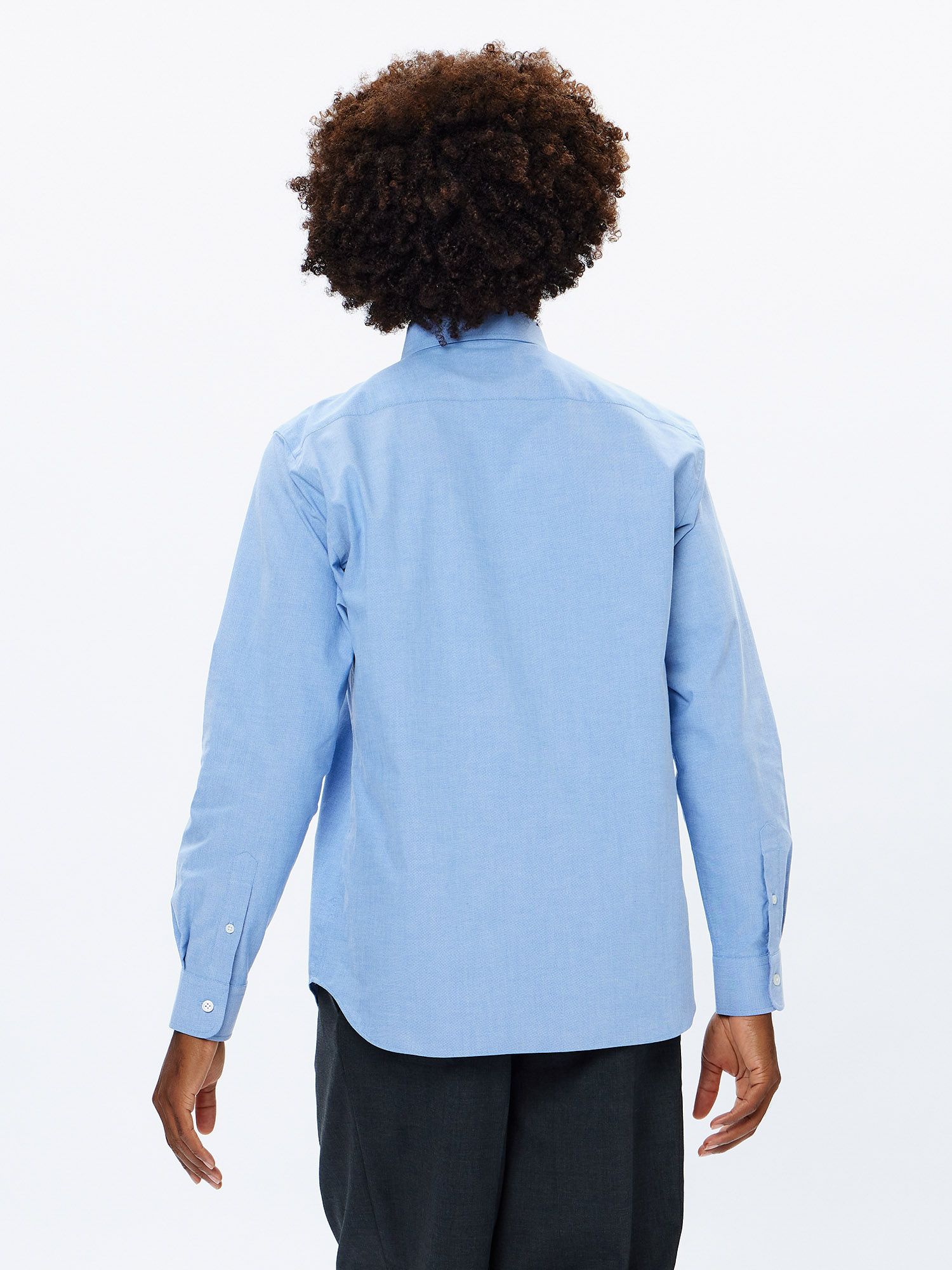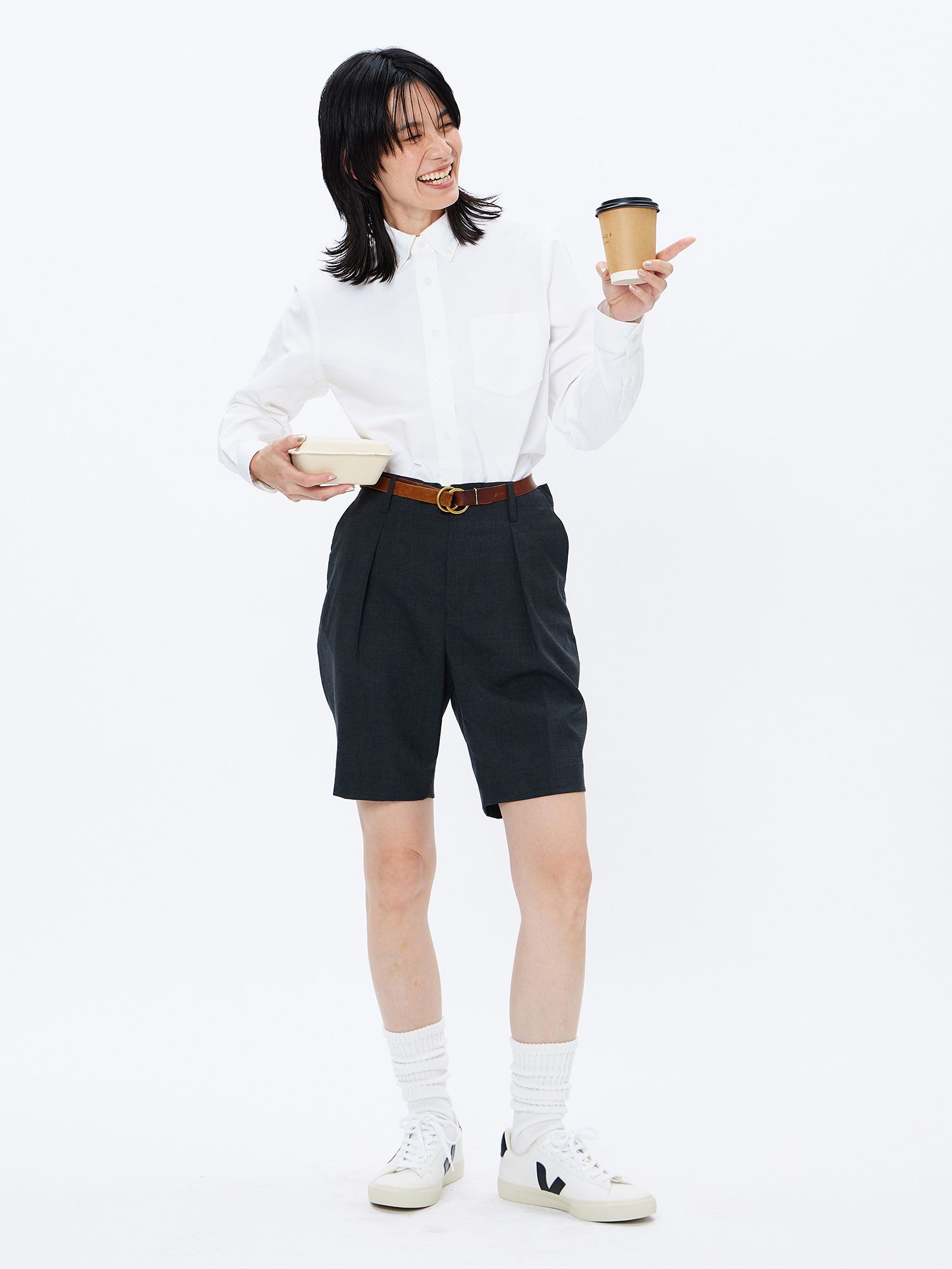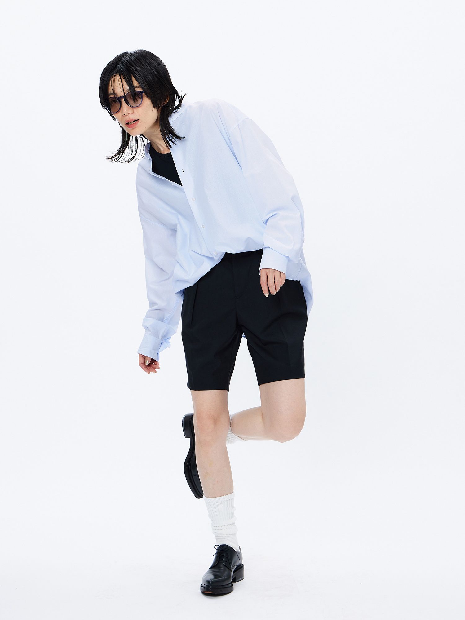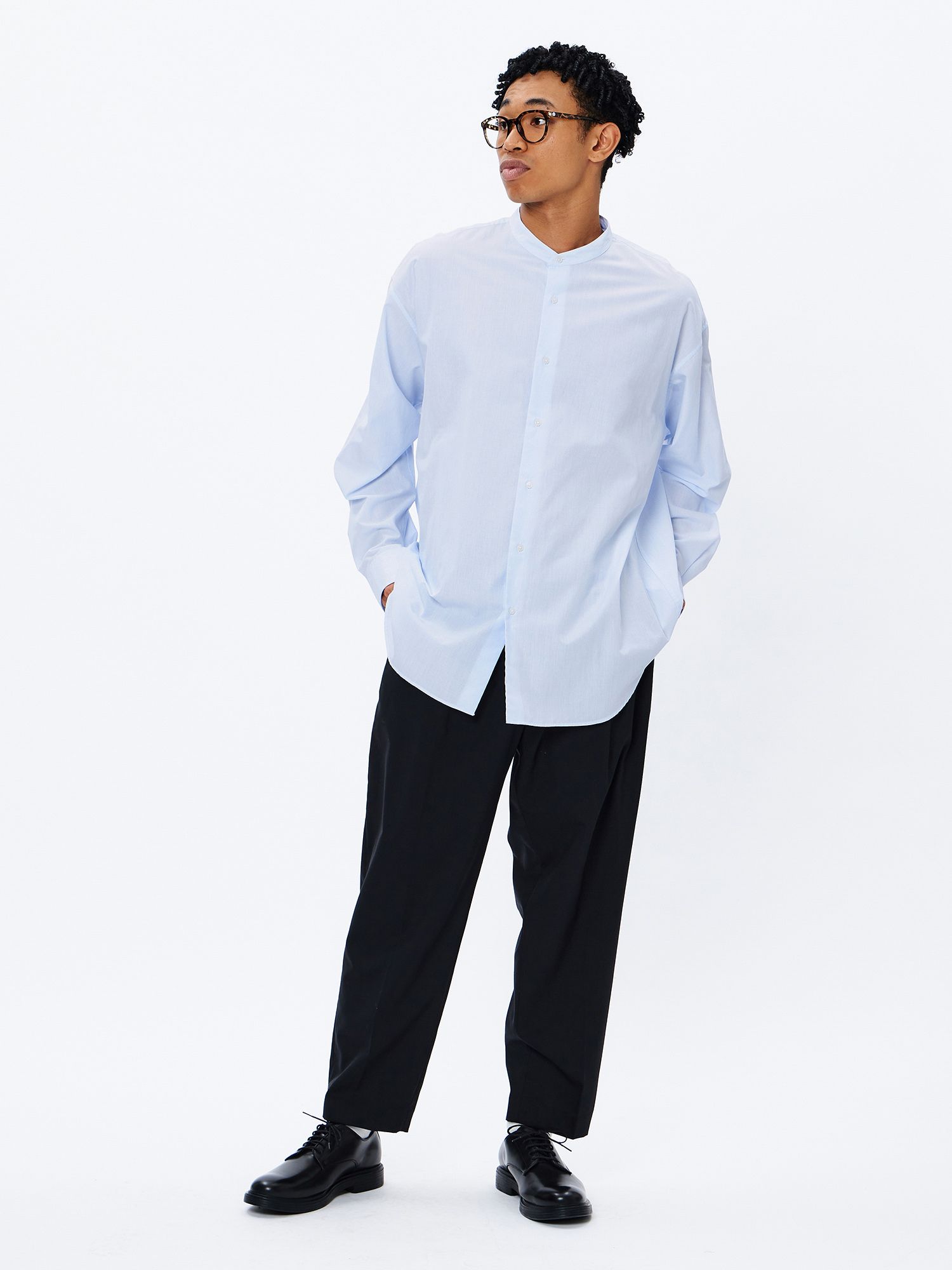 キレイめな見た目の生地感ながらシンプルなデザインで、様々な場面で活躍します。定番のボックスシャツとバンドカラーの2型をご用意。