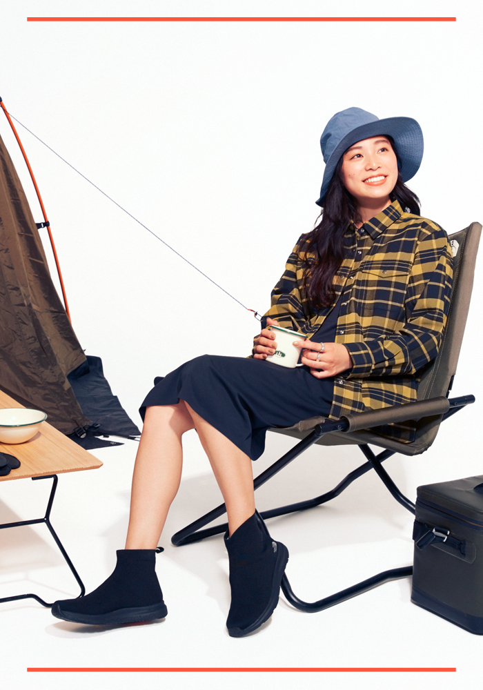 • キャンプは日の出とともに気温がぐんぐん上がりやすいので、涼しく過ごせるワンピース(UV PROTECT)もおすすめ。ハット(UV PROTECT)と長袖シャツ(UV PROTECT)を身につけてしっかり直射日光を防ぎましょう。素肌が出ている部分には、日焼け止めをお忘れなく。