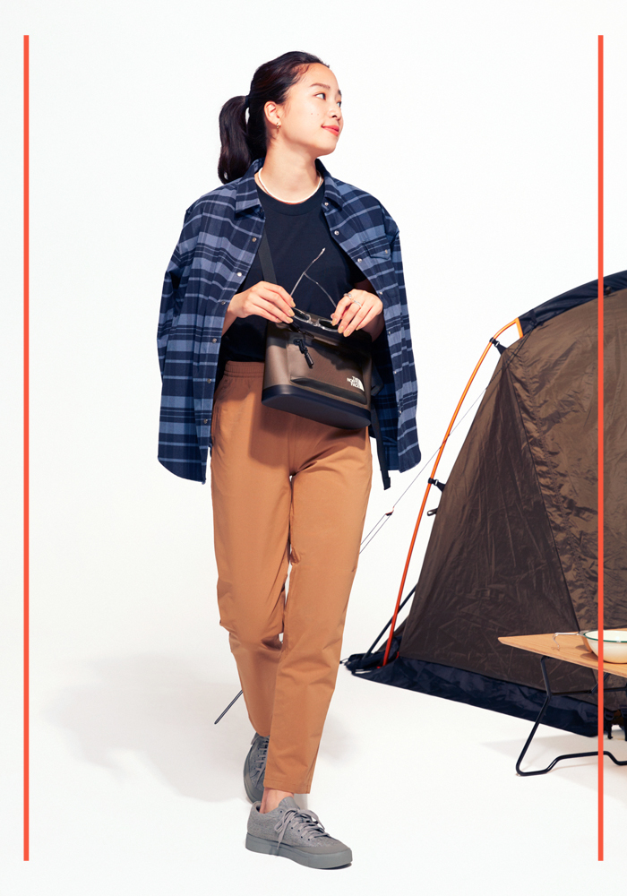 • キャンプ場や山の上は天気が変化しやすいので、スタイリングで臨機応変に対応できるように。くもりでも長袖のシャツ(UV PROTECT)とサングラスを持ち歩くことをおすすめします。
