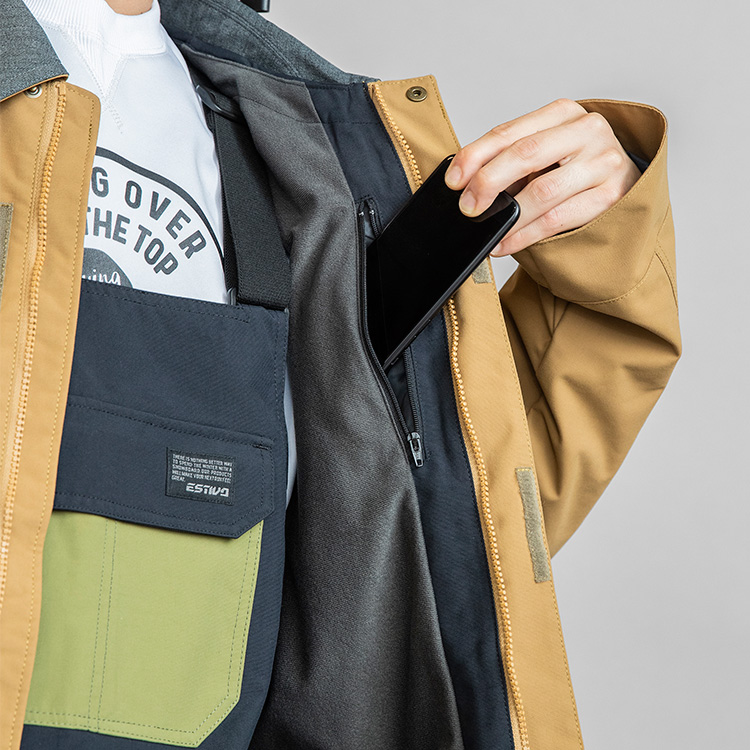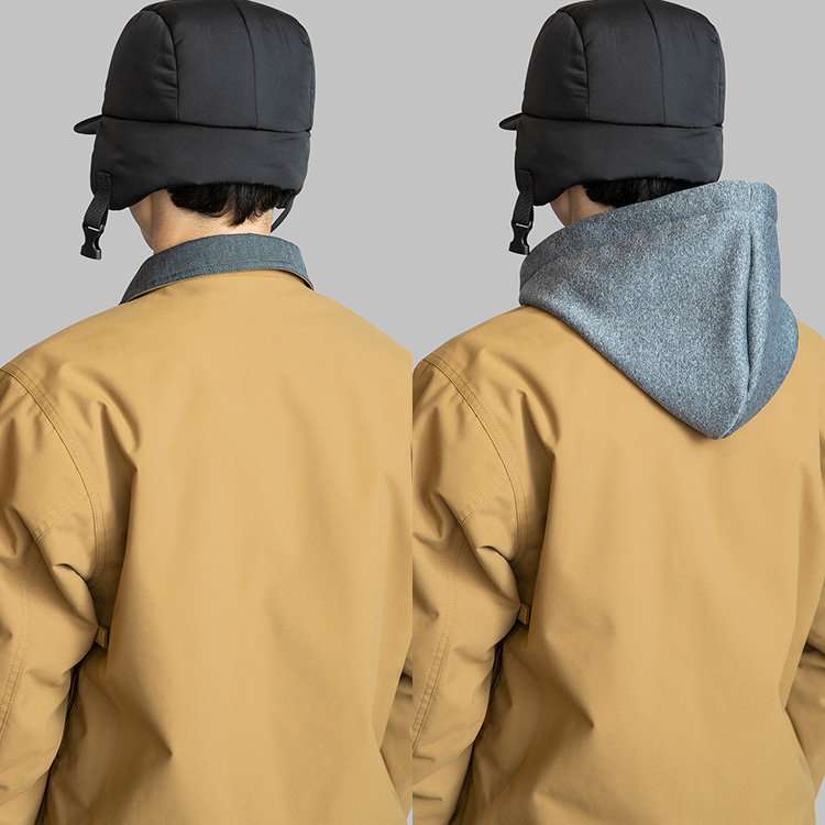 襟に使用した異素材やメタルボタン、大きな裾ポケットが特徴的なワークスタイルジャケット。防水性を持つフィルムをボンディングした3層構造のニットフードは取り外しが可能で、ジャケット本体だけでの着用も可能です。しっかりとした風合いの素材には10,000mm以上の耐水性加工を施し、ウエア内部の温度調整を可能にするベンチレーションをはじめ、雪や冷気の侵入を防ぐパウダースカート、左袖の便利なチケットホルダーなど装備も充実。裏地には発熱・蓄熱効果のある起毛素材を使用することで保温力を高めています。